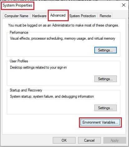 - Select Environment Variables from the Advanced tab of the System Properties window.