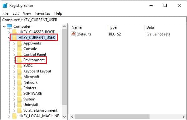 - On the registry editor window, go to HKEY_CURRENT_USER\Environment.