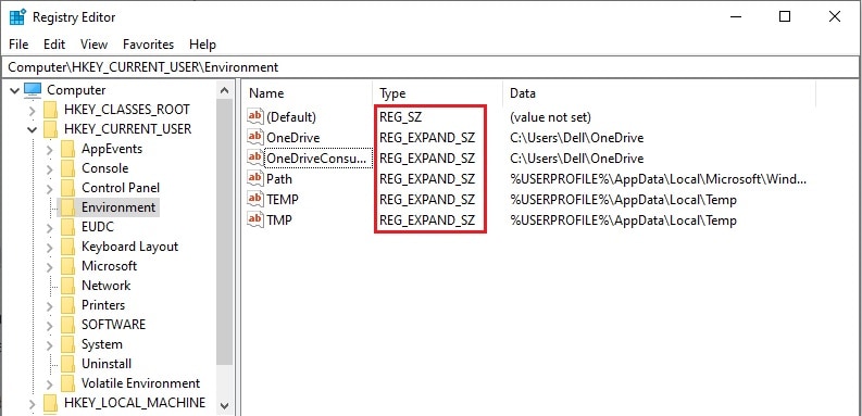- In the Environment section, ensure the value type is REG EXPAND SZ.