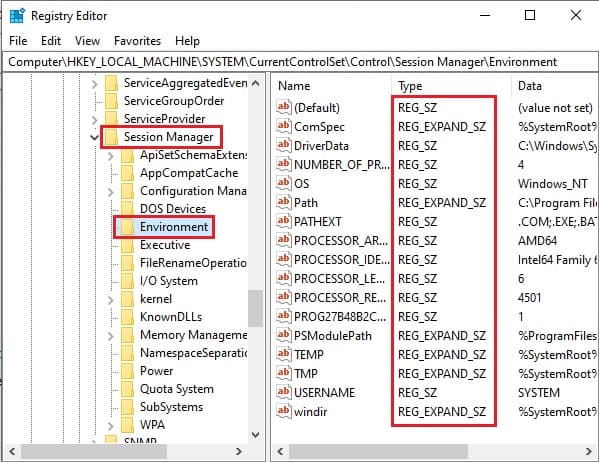 - Go to the HKEY_LOCAL_MACHINE\SYSTEM\CurrentControlSet\Control\Session Manager\Environment and check the value type.