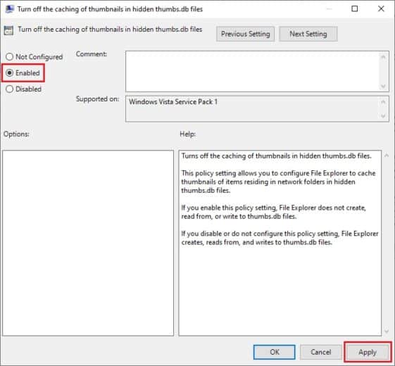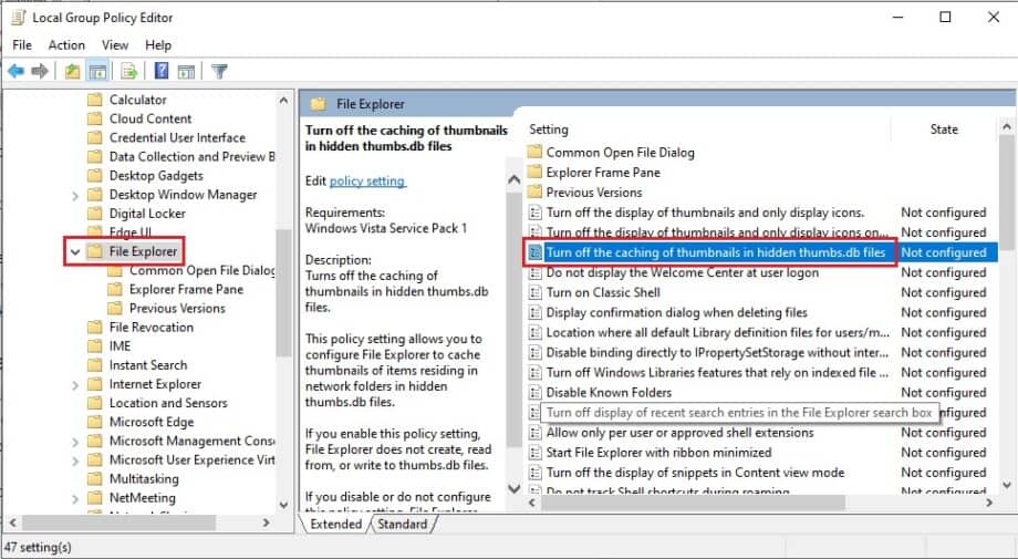 - Locate and double-click the Turn off the caching of thumbnails in hidden thumbs.db file to change it.