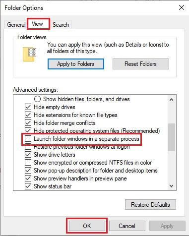 - Uncheck the item labeled Launch folder windows in a separate process under the View tab.