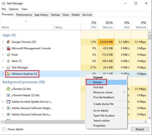 - Locate and right-click Windows Explorer in the Task Manager’s Processes tab.